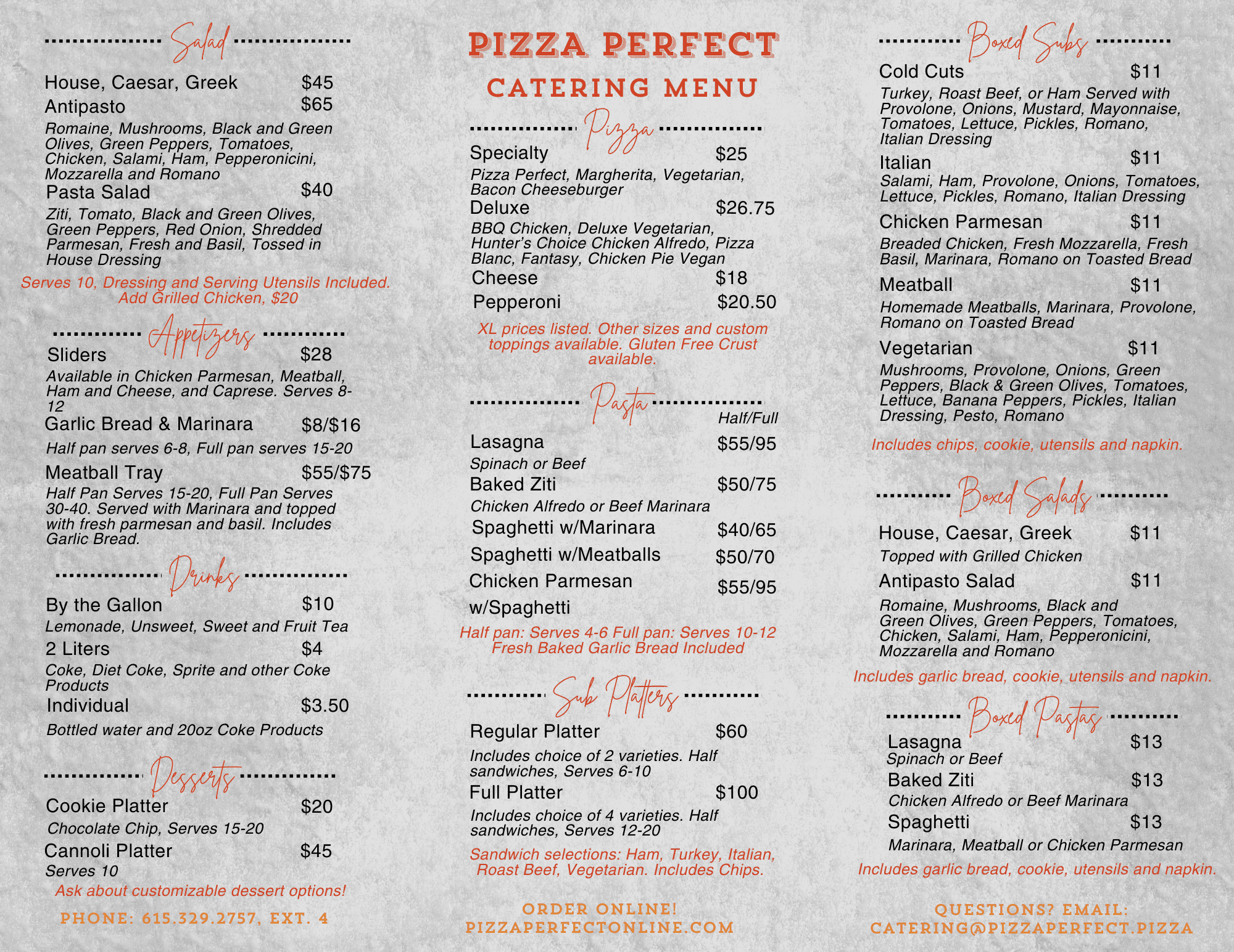 - Need help with menu choices or have more questions? Email catering@pizzaperfect.pizza or call 615.329.2757, Ext. 4 to leave a voicemail.